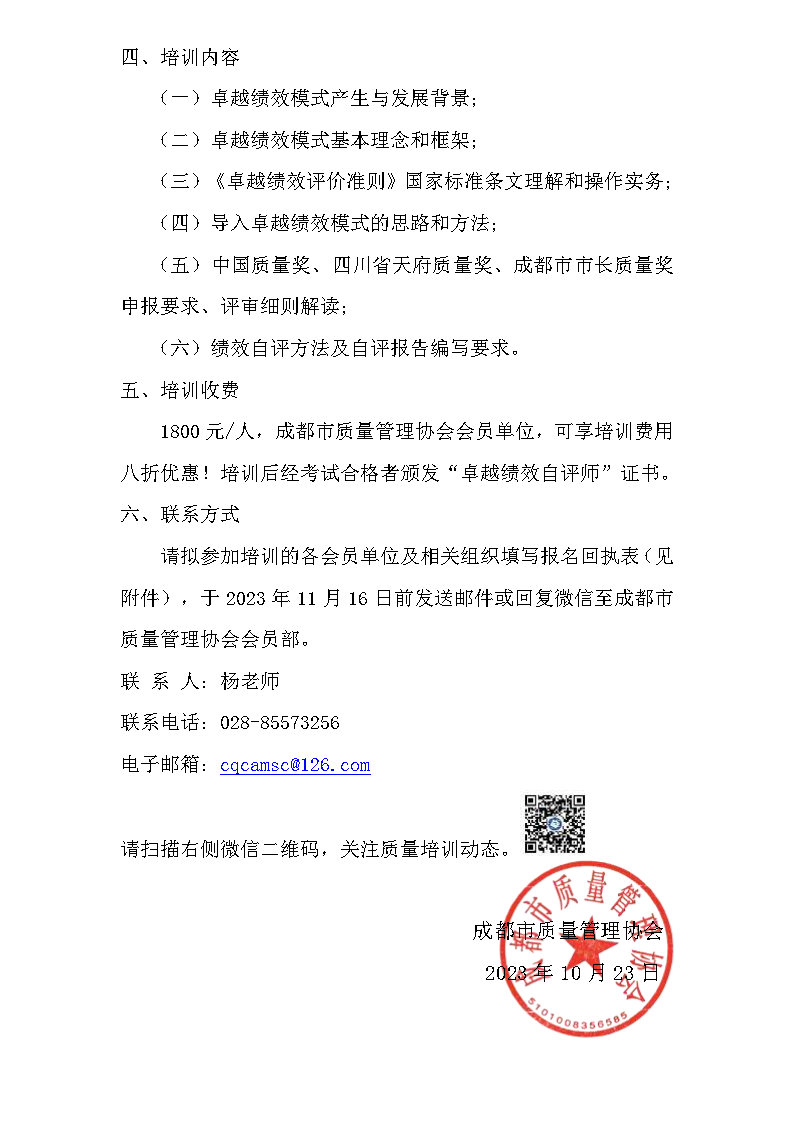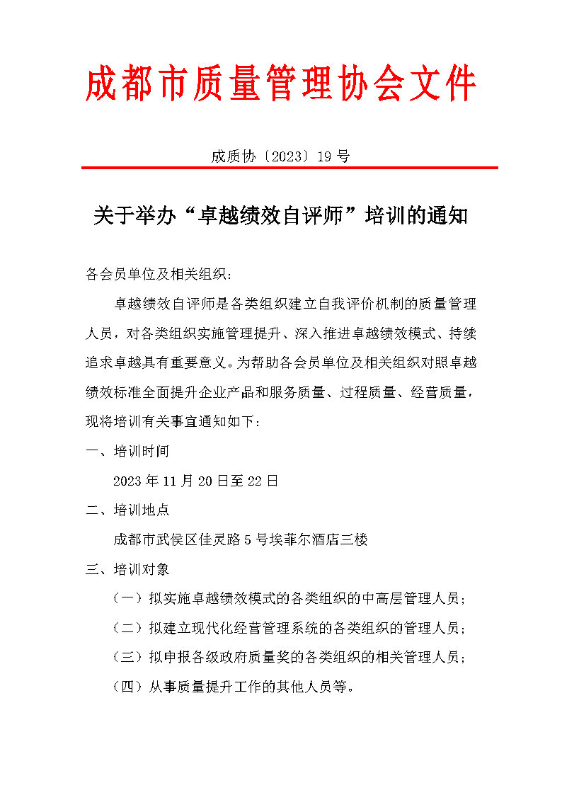 卓越绩效自评师是各类组织建立自我评价机制的质量管理人员,对各类组织实施管理提升、深入推进卓越绩效模式、持续追求卓越具有重要意义。为帮助各会员单位及相关组织对照卓越绩效标准全面提升企业产品和服务质量、过程质量、经营质量,现将培训有关事宜通知如下: