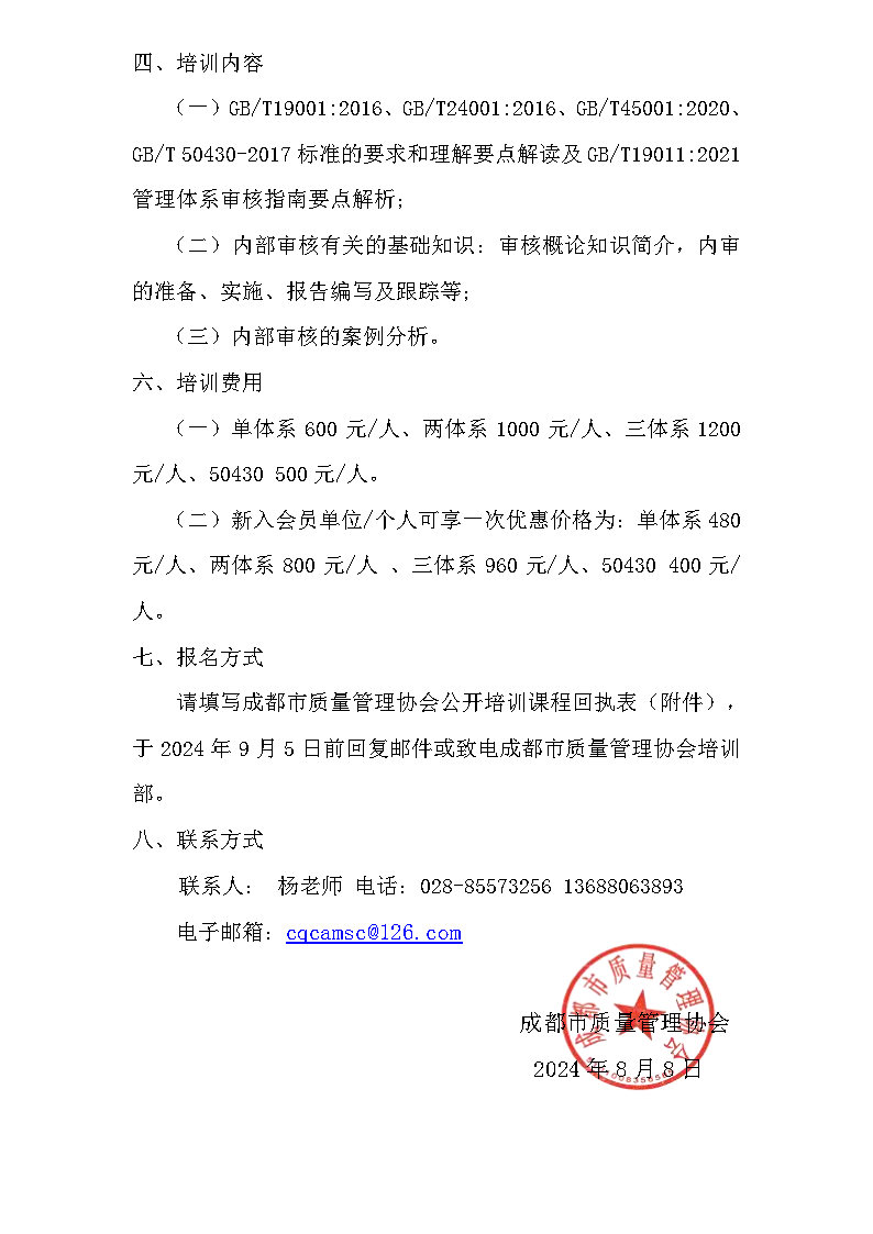 为帮助各会员单位及相关组织全面了解GB/T19001:2016、GB/T24001:2016、GB/T45001:2020、GB/T 50430-2017标准的要求,理解GB/T19011:2021 管理体系审核指南要求,培养掌握标准审核技巧的内部审核员,协会将开展管理体系内审员培训工作。现将有关培训事宜通知如下:
