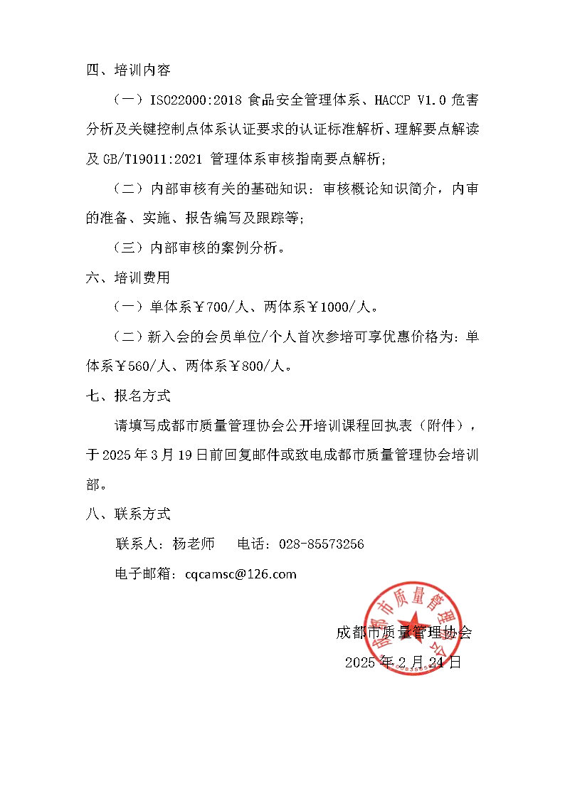 为帮助各会员单位及相关组织全面了解ISO22000:2018食品安全管理体系及HACCP V1.0危害分析及关键控制点体系认证要求的认证标准、相关法律法规,培养掌握标准审核技巧的内部审核员,协会将开展食品企业管理体系内审员培训工作。现将培训相关事宜通知如下: