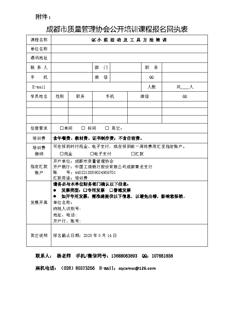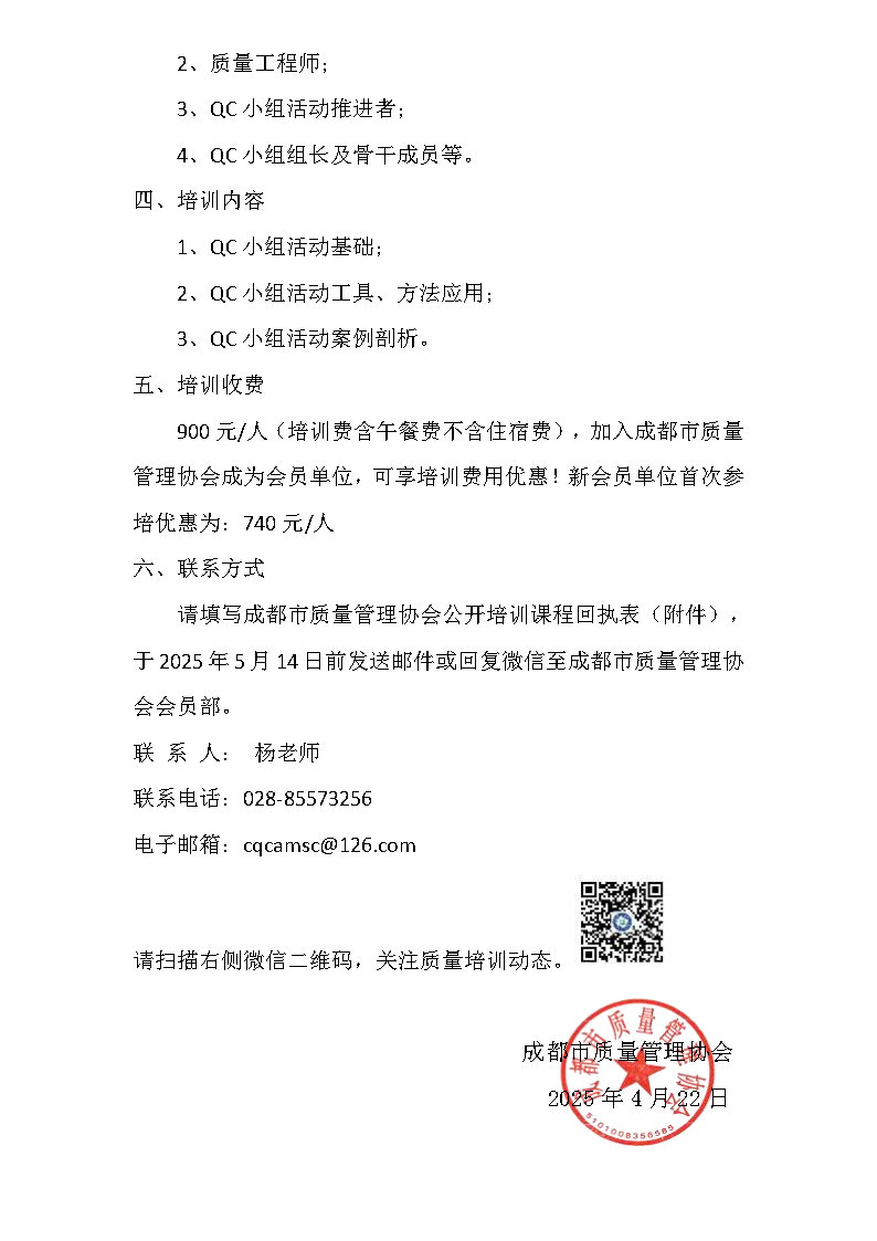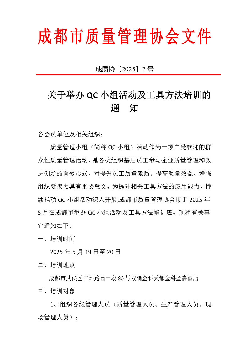 质量管理小组(简称QC小组)活动作为一项广受欢迎的群众性质量管理活动,是各类组织基层员工参与企业质量管理和改进创新的有效形式,对提升员工质量素质、提高质量效益、增强组织凝聚力具有重要意义。为提升相关工具方法的应用能力,持续推动QC小组活动深入开展,成都市质量管理协会拟于2025年5月在成都市举办QC小组活动及工具方法培训班。现将有关事宜通知如下: