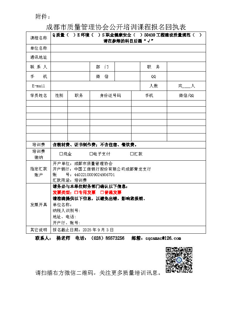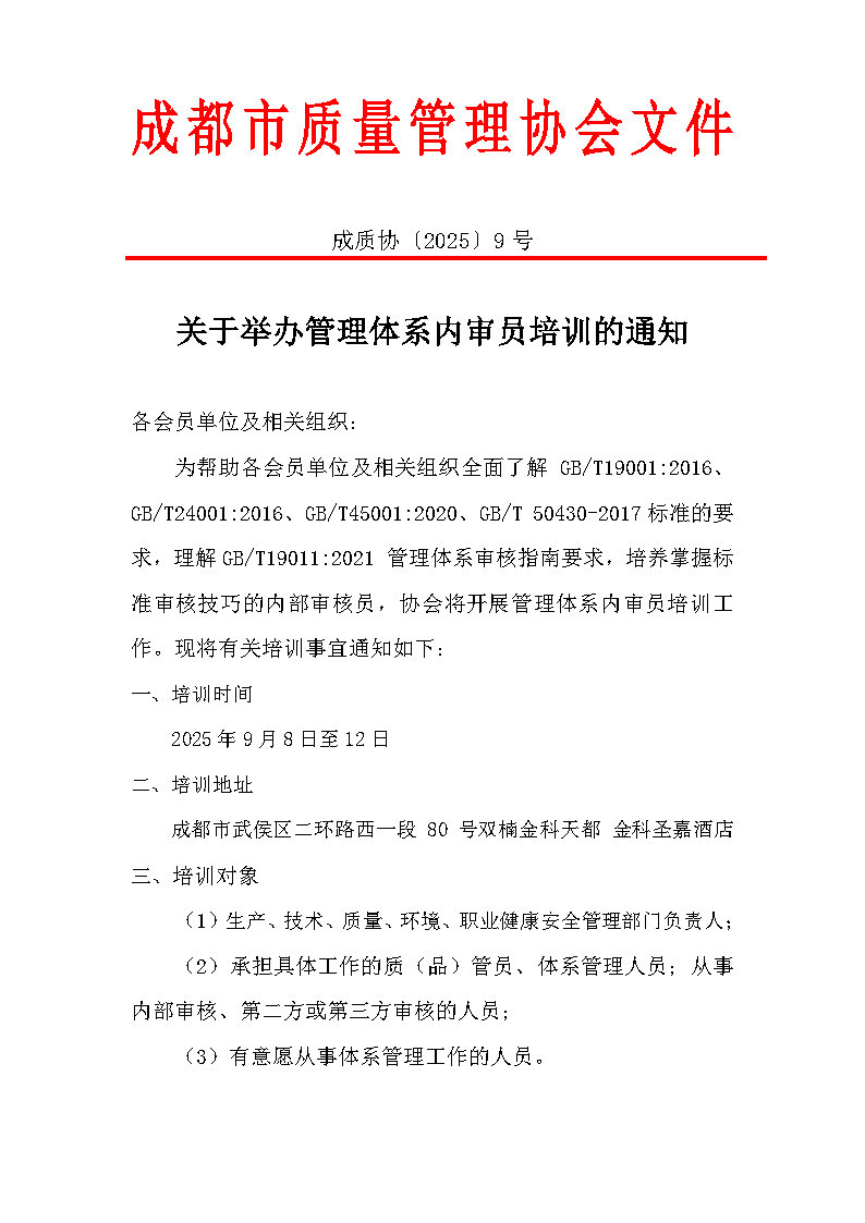 为帮助各会员单位及相关组织全面了解GB/T19001:2016、GB/T24001:2016、GB/T45001:2020、GB/T 50430-2017标准的要求,理解GB/T19011:2021 管理体系审核指南要求,培养掌握标准审核技巧的内部审核员,协会将开展管理体系内审员培训工作。现将有关培训事宜通知如下: