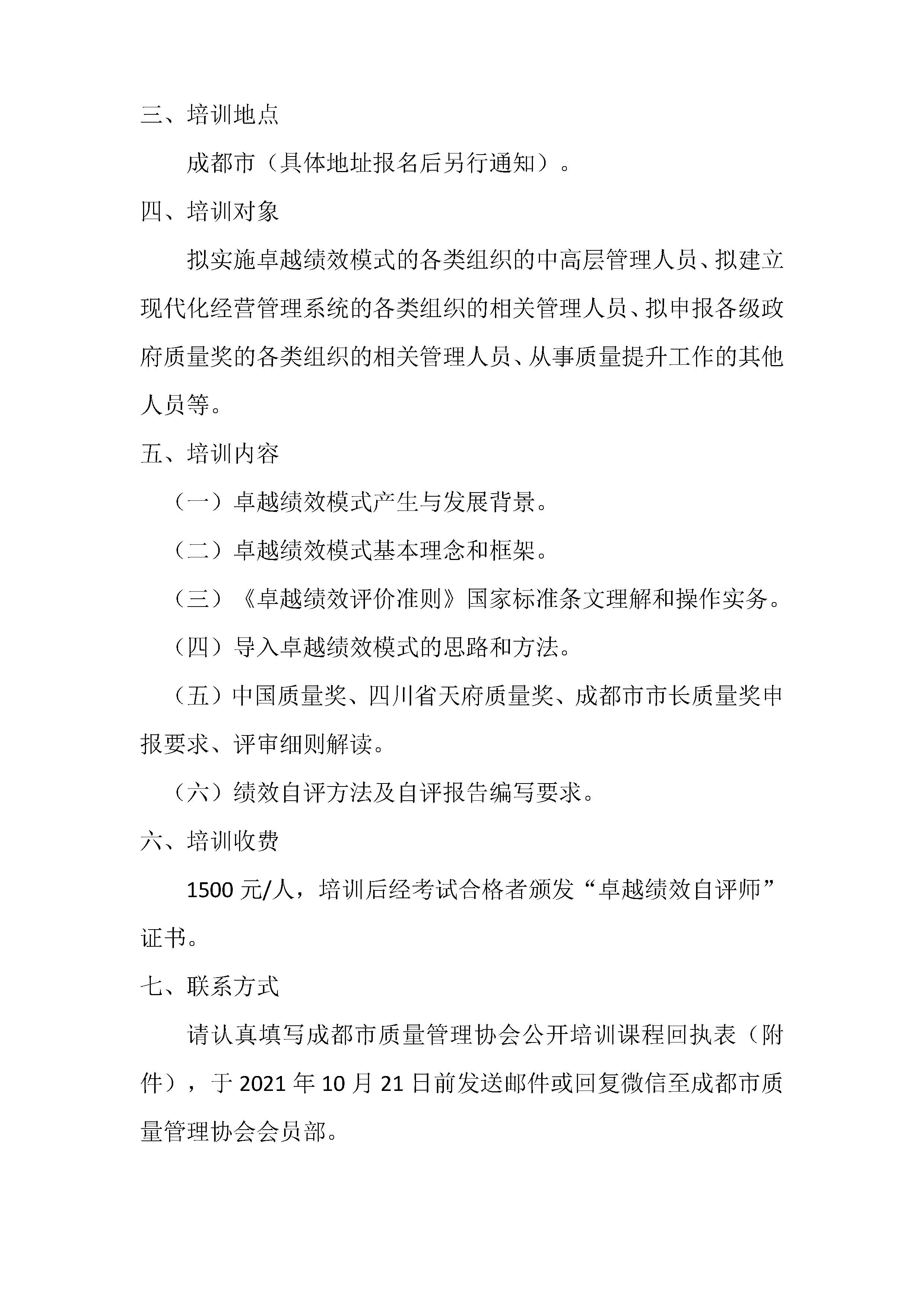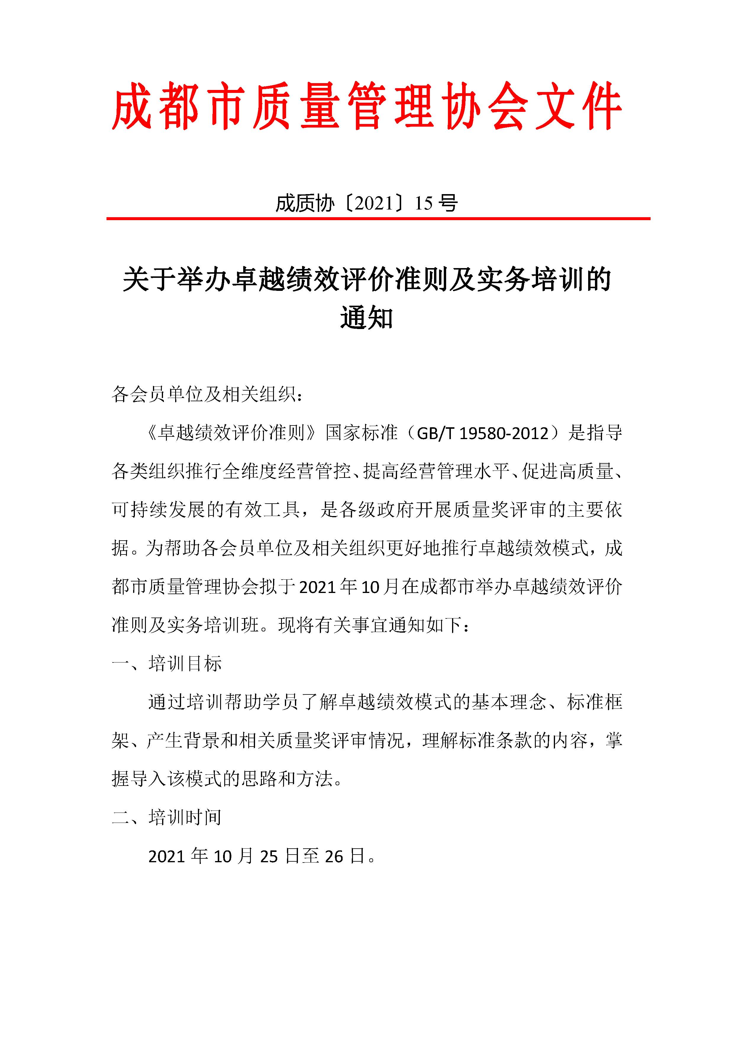 《卓越绩效评价准则》国家标准(GB/T 19580-2012)是指导各类组织推行全维度经营管控、提高经营管理水平、促进高质量、可持续发展的有效工具,是各级政府开展质量奖评审的主要依据。为帮助各会员单位及相关组织更好地推行卓越绩效模式,成都市质量管理协会拟于2021 年10 月在成都市举办卓越绩效评价准则及实务培训班。现将有关事宜通知如下: