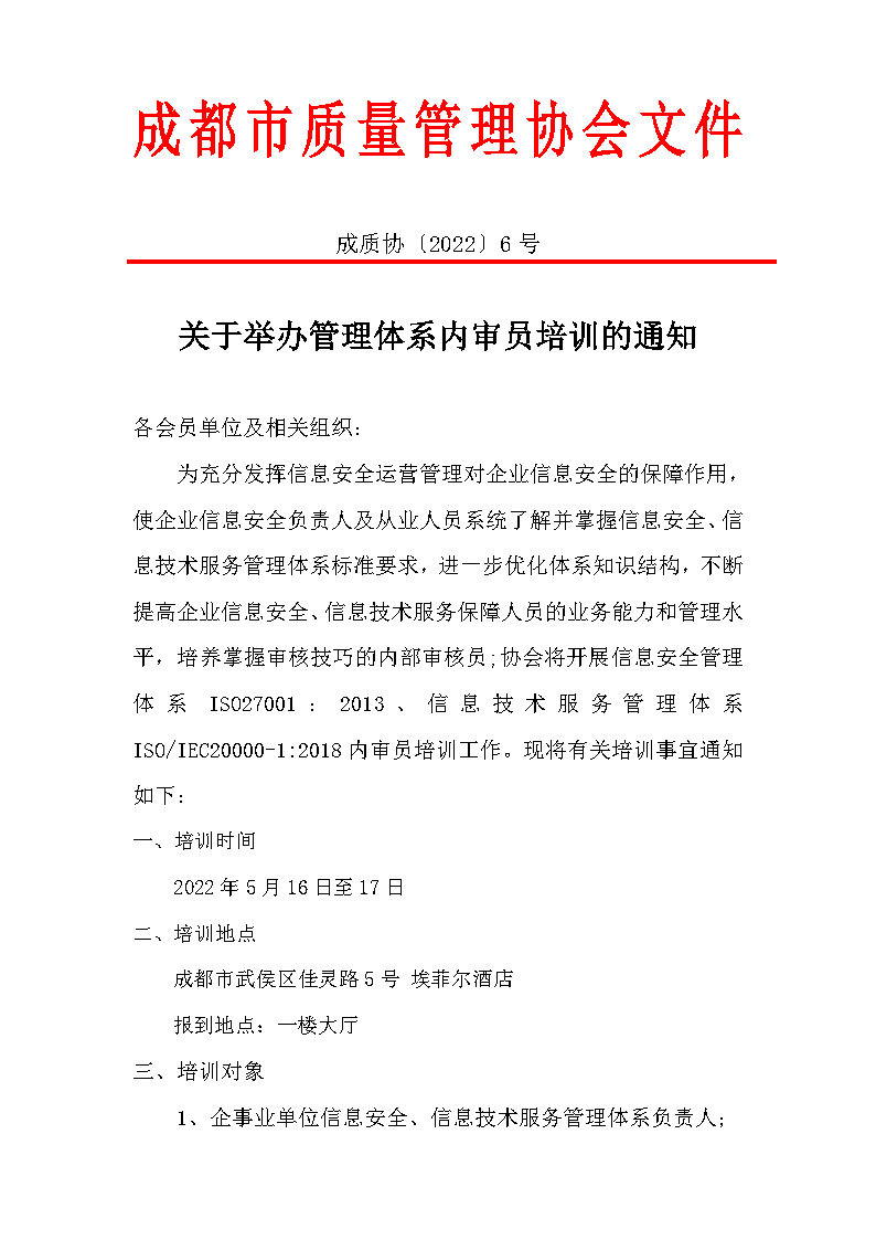 信息安全、信息技术服务管理体系内审员培训通知