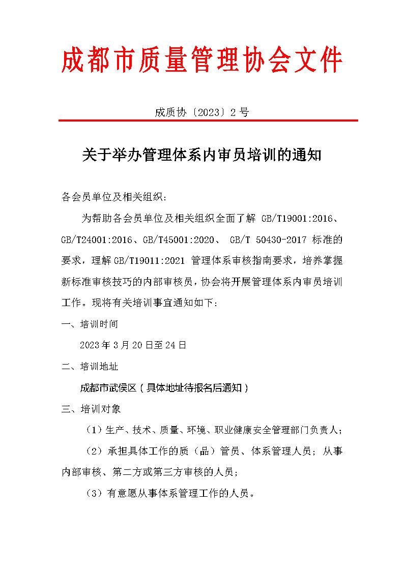 为帮助各会员单位及相关组织全面了解GB/T19001:2016、GB/T24001:2016、GB/T45001:2020、 GB/T 50430-2017标准的要求,理解GB/T19011:2021 管理体系审核指南要求,培养掌握新标准审核技巧的内部审核员,协会将开展管理体系内审员培训工作。现将有关培训事宜通知如下:
