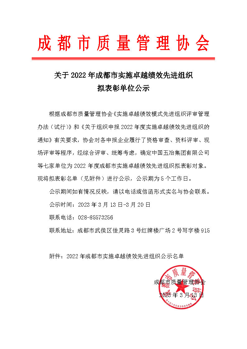 根据成都市质量管理协会《实施卓越绩效模式先进组织评审管理办法(试行)》和《关于组织申报2022年度实施卓越绩效先进组织的通知》有关要求,协会对各申报企业履行了资格审查、资料评审、现场评审等程序,经综合评审、统筹考虑,确定中国五冶集团有限公司等七家单位为2022年度成都市实施卓越绩效先进组织拟表彰对象。现将拟表彰名单(见附件)进行公示,公示期为5个工作日。
