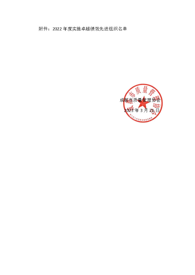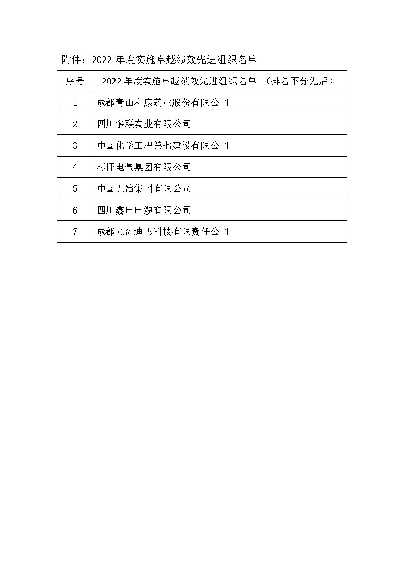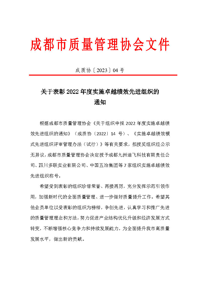 根据成都市质量管理协会《关于组织申报2022年度实施卓越绩效先进组织的通知》(成质协〔2022〕14 号)、《实施卓越绩效模式先进组织评审管理办法(试行)》等有关要求,拟授奖组织经公示无异议,成都市质量管理协会决定授予成都九洲迪飞科技有限责任公司、四川多联实业有限公司、中国五冶集团等7家组织实施卓越绩效先进组织称号。
